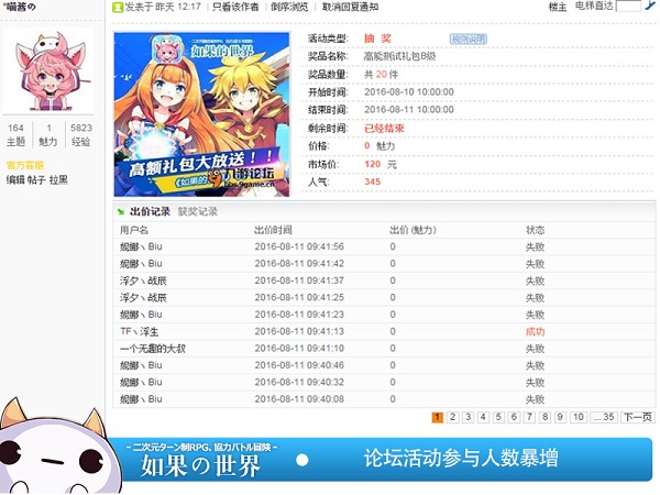 而喵酱送给小伙伴们的福利楼人气也是很高呢,一共被小伙伴们刷出了35页,果然是摩天大楼!那个叫浮生的游友你你的运气真的很赞哎,只抽一次就得到礼包了呢(づ ̄ 3 ̄)づ没有得到A、B礼包的游友也不怕,喵酱还会继续发福利的哟!