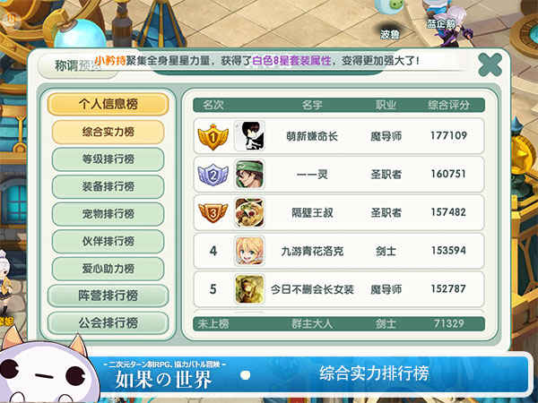 先给小伙伴们奉上一张综合实力榜的截图吧!第一名就是魔导师萌新嫌命长(ID:4068329)同学啦,综合评分为1771019分,这真的是萌新吗?你家还缺摆设吗?快来收下喵酱做挂饰吧!