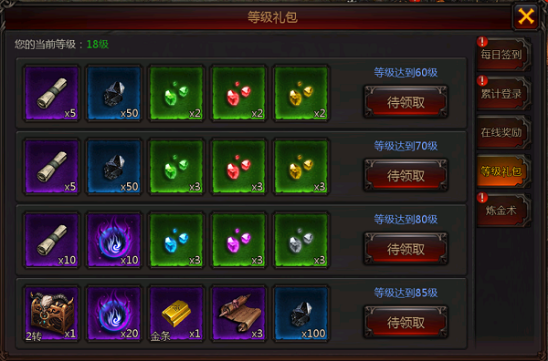随着你等级提升,你就能开启专属与你的等级福利,除了金币和各种材料,最重要的还有转职神装送,让你成神之路更加平坦。