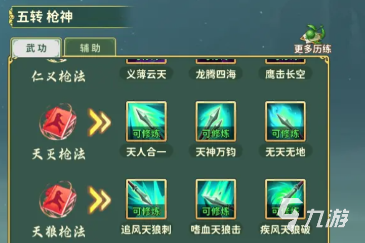 3转去点满增加攻击力的“乾坤挪移”,乾坤挪移是输出的关键核心,但如果打PVP的会更加建议能提升生命值的横练太保,4转点增加伤害的怒意之吼以及末日狂舞,5转点增加武功防御的灵甲护身。