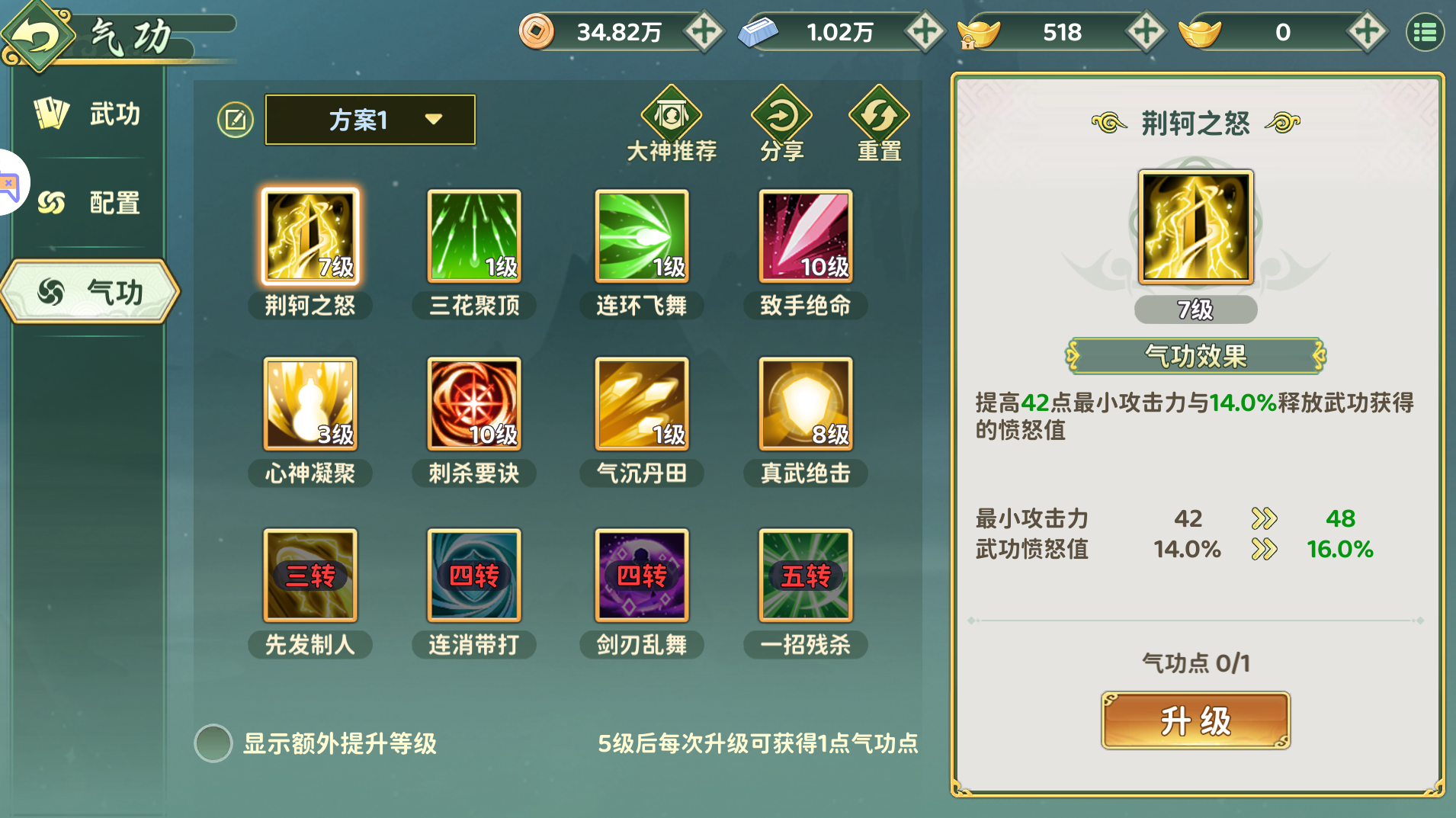 点了荆轲之怒后,武功和气功相辅相成,相当于一直是开大招的状态。