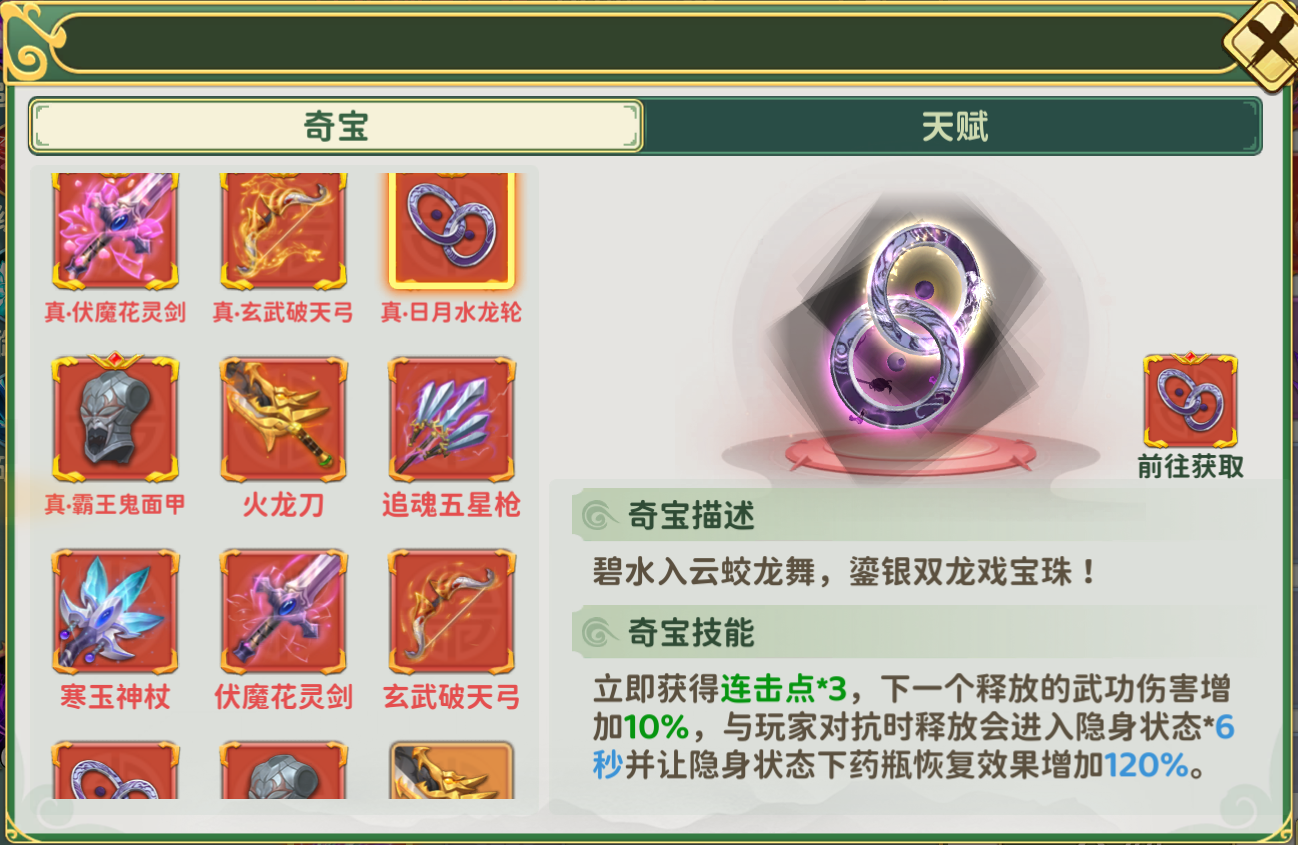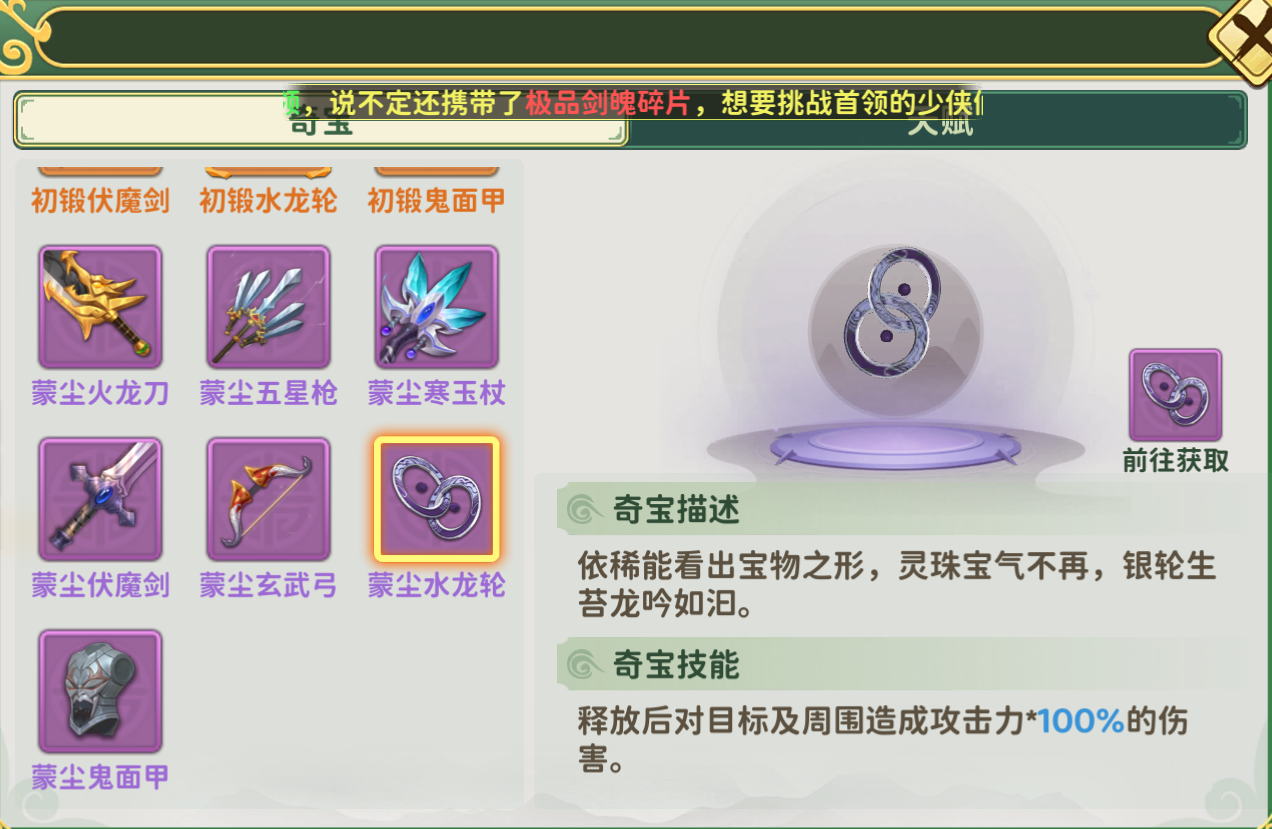 这个对刺客职业来说就有奇效了,众所周知刺客的武功释放频率很高,并且还有超必杀武功,如果在超必杀武功前使用奇宝技能,能够极大增加超必杀武功的伤害。