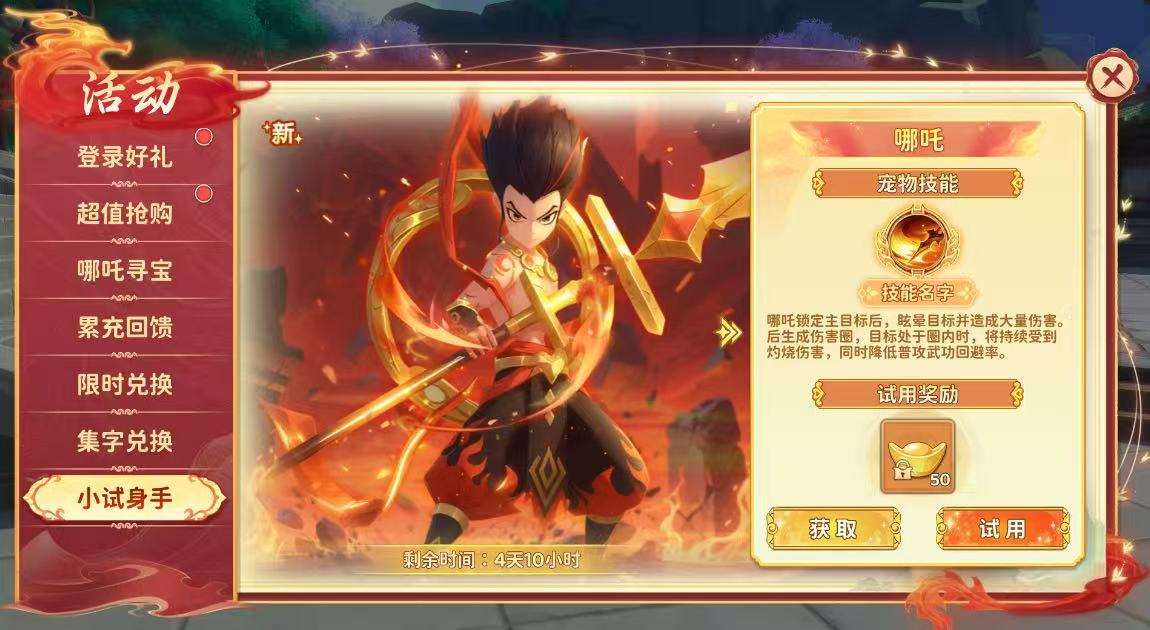 活动期间可免费试用神宠技能与特效,体验专属战斗加成,试用完成后还能领取绑定元宝奖励!既能试玩新宠,又有实惠福利,怎能错过?