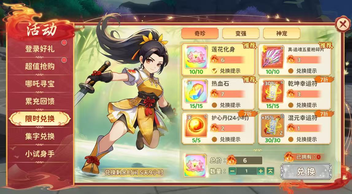 可用活动代币兑换真·追魂五星枪碎片、热血石、莲花化身等超稀有道具。积攒足够资源,即可兑换全新坐骑与高阶装备,战力突破再无瓶颈!