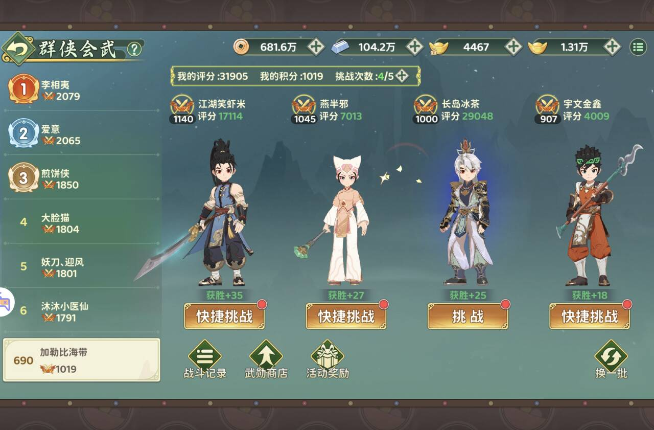 【群侠会武】,每天五次,想尽快结束,不急着升积分的,可选择低于自己的快捷挑战。