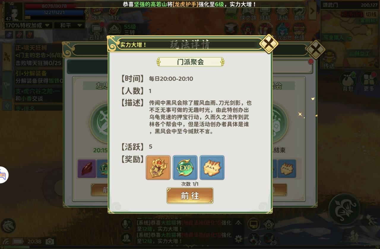 兄弟们8点上线咱们直接就是去【门派聚会】,按自己需求、帮派要求选择是否要做,不强制的可在8:10左右上线。