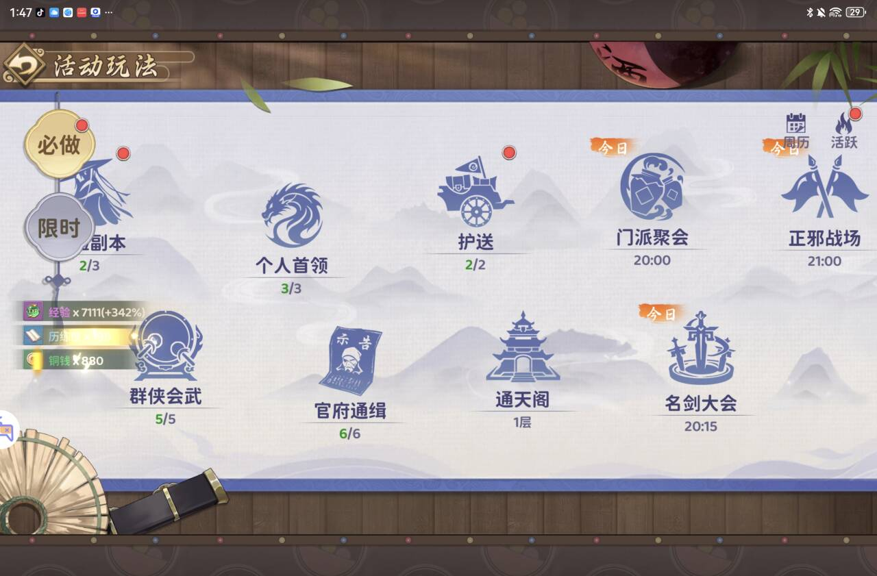 优先级黄金法则:限时活动>永久性资源(侠义/帮贡)>挂机产出。