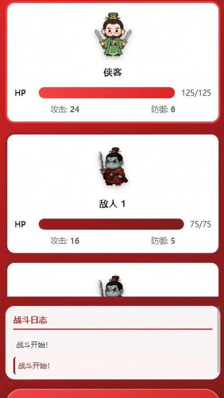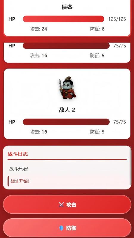 《热血桃园斗》是一款以回合制战斗为核心的闯关游戏,主打策略性与渐进式挑战。玩家将在充满热血气息的战场中,通过合理规划每一步行动,击败层层强敌,最终攻克全部 20 个关卡,成为传说中的最强战士。游戏开局,玩家将直面逐步升级的敌人,每一关都设有独特的挑战机制。战斗系统围绕 “攻击”“防御”“技能” 三大核心操作展开:基础攻击可稳定对敌人造成伤害,伤害值由玩家当前攻击力(ATK)决定;防御指令能大幅降低本回合受到的伤害,尤其适用于预判敌人强力攻击时使用;技能则是爆发性输出手段,可造成远高于普通攻击的伤害,但每次使用后会进入冷却状态,需合理把控释放时机。角色属性是战斗胜负的关键。生命值(HP)是生存的基础,一旦归零时游戏失败;攻击力(ATK)直接影响输出强度,随关卡推进可通过胜利奖励提升;防御力(DEF)则能减免受到的伤害,为持久战提供保障。三者相互制衡,玩家需根据敌人特性调整策略 —— 面对高攻低防的敌人可侧重猛攻,遭遇血厚防高的对手则需搭配防御与技能消耗。关卡设计呈现阶梯式难度增长,从初期的基础敌人到后期的精英 BOSS,敌人的属性与战斗模式会不断升级,例如部分高阶敌人会使用特殊技能,或拥有阶段性防御加成,考验玩家的临场应变能力。每通关一关,玩家将获得属性提升或技能强化,为后续挑战积累优势,形成 “战斗 - 成长 - 再挑战” 的正向循环。游戏界面融入热血武侠元素,背景装饰以武器与火焰符号强化战斗氛围,简洁明了的操作按钮让新手也能快速上手。除核心战斗外,“玩法说明” 功能可随时查阅规则,帮助玩家快速掌握系统机制。无论是追求快速通关的策略达人,还是享受逐步成长的养成爱好者,都能在《热血桃园斗》中找到乐趣。20 关的挑战之路充满变数,唯有审时度势、合理搭配操作,才能突破重重阻碍,登顶最强战士的宝座。