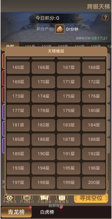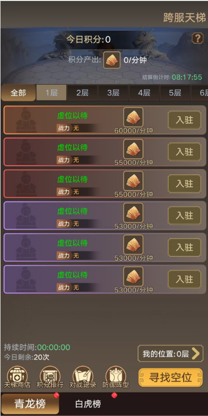 1.跨服天梯共有200层,每层有6个席位,每个席位都有对应的积分,占领可持续获得积分,排名越靠前,每分钟的积分越多。