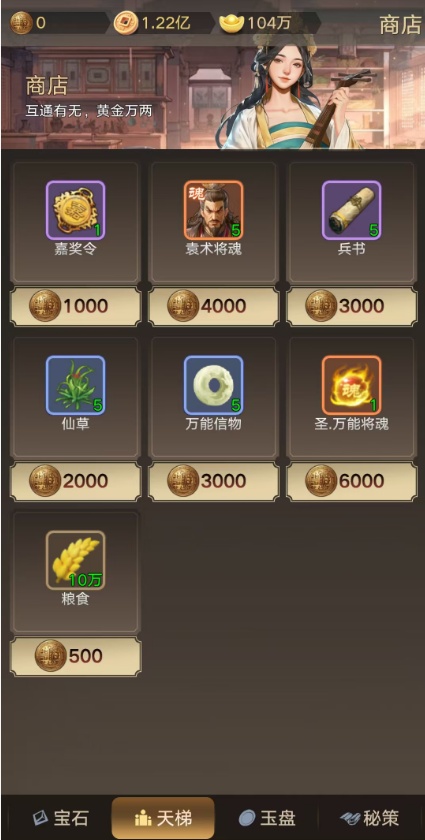 4.天梯币主要用于在天梯商店中兑换所需道具,其中可兑换:袁术,12统帅,群雄,步兵。