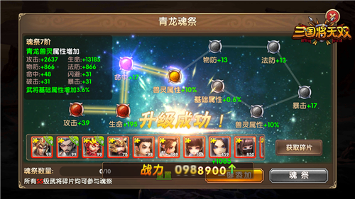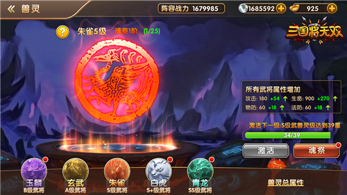 如今幻兽的力量已凝聚成华丽的图腾,只待武将们的星级达标,即可激活潜力。兽灵分为“玉麟、朱雀、青龙”等多个等级,分别对应着各个品质的武将。激活兽灵属性后还可以进行魂祭,消耗武将碎片即可逐步提升魂祭等级,从而获得魂祭属性!因此武将的升星和兽灵养成之间如何进行取舍,则要看你的养成策略啦!