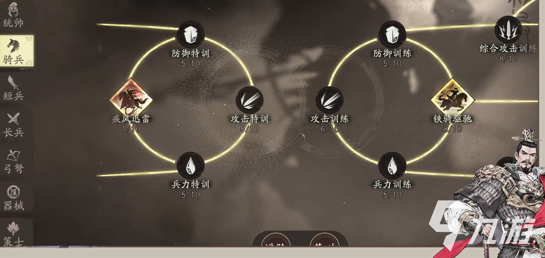 游戏提供的兵种选择是极其丰富的,包括了短兵、骑兵、弓弩等多种传统兵种,每种兵种又衍生出不同的进阶形态,具备独特的技能与属性,玩家可以针对这些兵种进行定制化训练,例如:骑兵就可以进行防御特训、兵力特训、疾风迅雷训练等。建议大家最好根据战场的实际情况,灵活搭配兵种,当然,技能释放的时机也要合适。