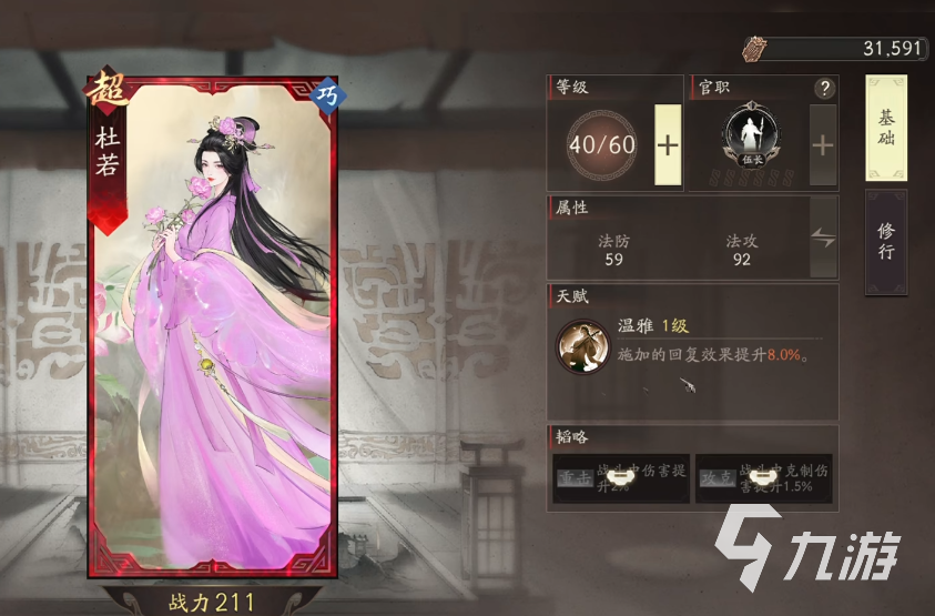 杜若在属性上属于“巧”,游戏在战斗机制上有属性相克机制,巧能克制勇,同时受制于严。在对战开始前能了解多方的属性,利用属性克制也能帮助玩家更好的应战。杜若的天赋是“温雅”,每提升一次能增加恢复效果。在韬略上可以选择增加攻击属性或者是属性克制效果。