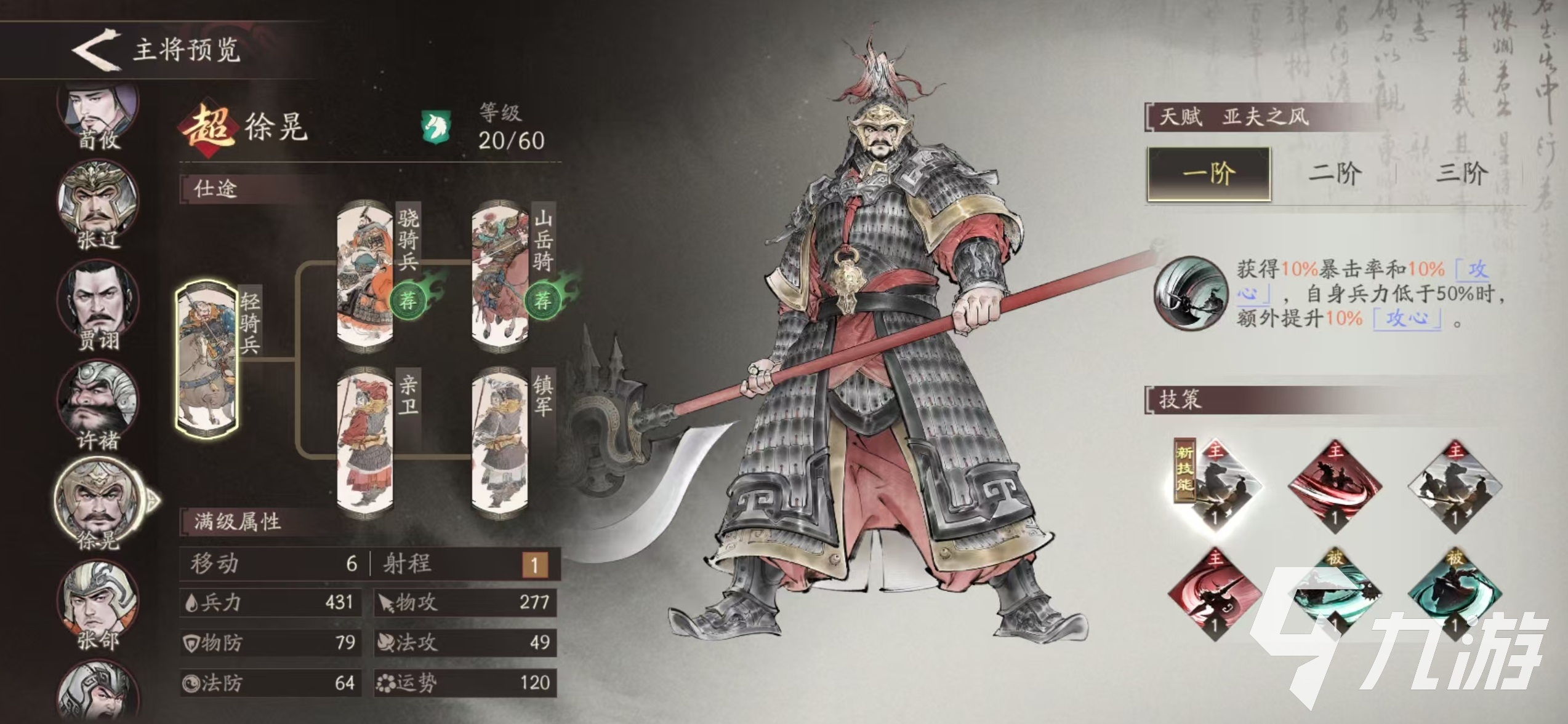 徐晃在游戏中是一名比较适合平民玩家选择的武将,在基础属性方面,虚晃作为超品角色,自然各个属性综合性都比较强,它自身属于猛攻型的武将,带领的是轻骑兵。天赋亚夫之风,可获得10%暴击率和10%攻心,在自身兵力低于50%的时候,额外提升10%攻心。攻心是输出武将很重要的状态,造成伤害时会恢复部分兵力,和造成的伤害值相关,而且攻心可以叠加起来,并且不可被清除。