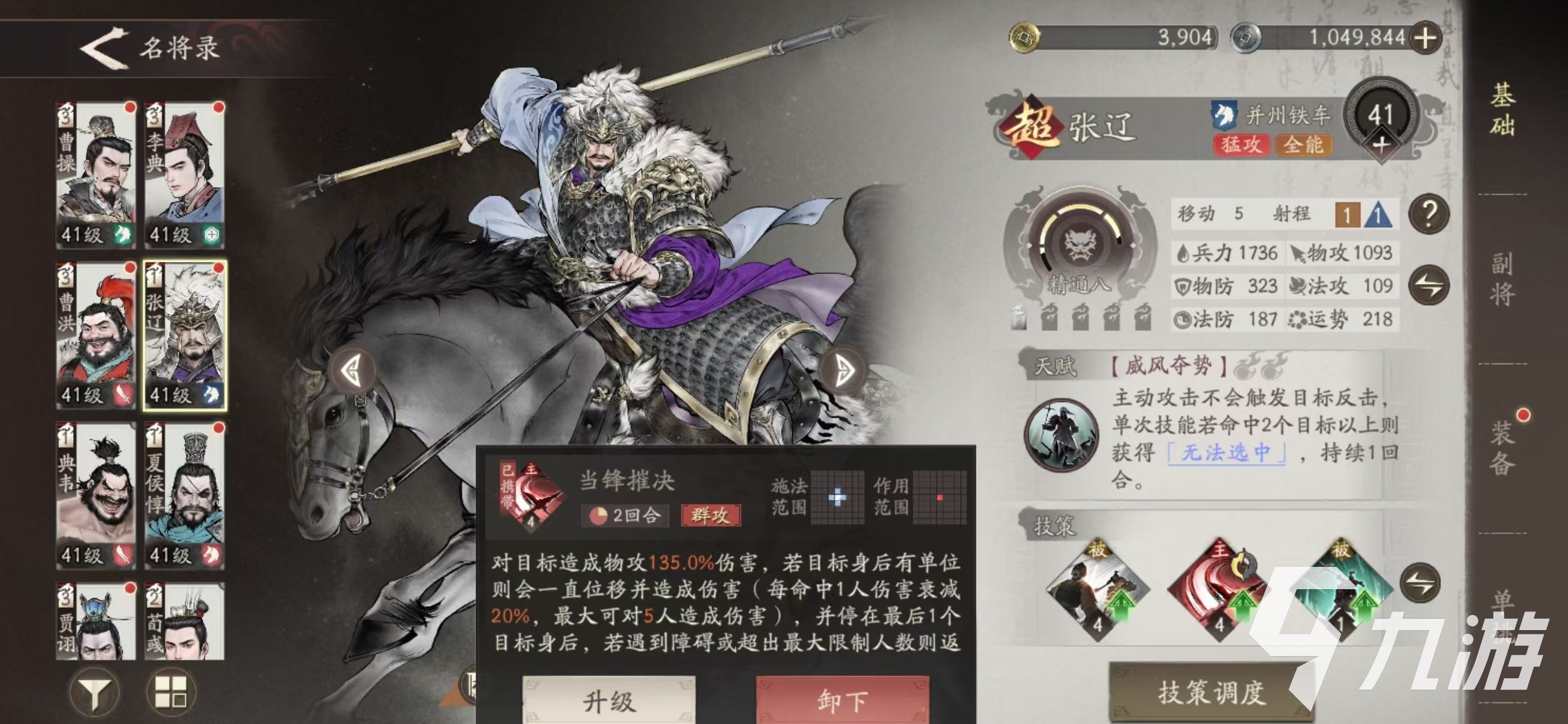 张辽作为骑兵型武将,机动性非常强势,很适合开荒的人选,在转职之后还能给队友提供增益关键的技能,赋予队友冲锋效果,大幅度提升队伍机动性。对这套全骑兵阵容来说,张辽是核心发动机。夏侯敦是前排肉盾型角色,利用自身受到伤害后反击和吸血,既能够打出伤害又能稳稳站在前排,帮助队友减少伤亡。