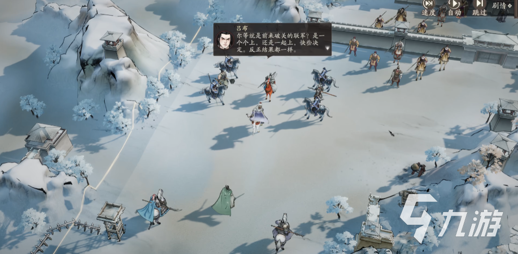 红点是真不少,好在排得还算整齐,一个接一个清起来不算太乱,对我这种见不得红点的人还算友好。配音挺入戏的,平时语气平稳,一开打节奏立马提上来,氛围一下就变了。最戳我的是战斗时的演出,对话时有战术互动的感觉,打起来是回合制你来我往,还有动画演出,不能跳但能自动打,也能开高速省时间。像守株待兔这类经典战术都有用,地形这些条件也能蹭上,能操作的地方挺多。前头几关靠自动基本稳过,后面估计就得自己动脑子了