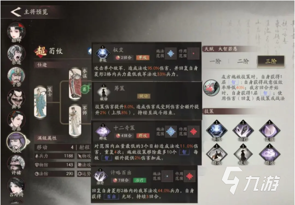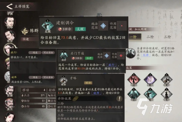 虽然他的”建制调令”会减少队友单体CD最长的技能2回合冷却,但是给目标回复73战意的效果其实更实用,这还是橙色的;而荀攸的天赋被动,让大家无需依赖战法,陈群的”名门亨通”有中等施法距离,由于被动的原因,需要一直跟着C位走,经常被忽略。