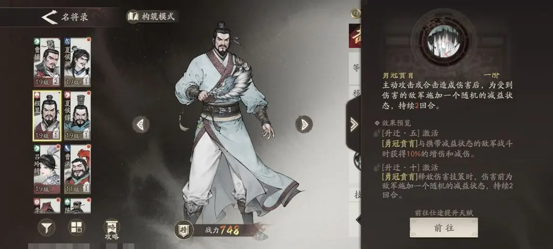 他的初始天赋,在主动攻击,包括群攻,合击造成伤害之后,都能给敌军添加1个随机的负面buff,维持2轮;2阶天赋在和有DEBUFF的敌方部队战斗时,增撒好难过减伤效果均提升10%;3技能在使用技能时,打出伤害之前,就会给敌军添加负面效果,只靠个人就能将二阶增伤完美触发。