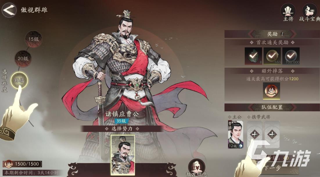武将最多可以携带两位,然后大家可以将视角挪动到右手边,在这里可以看到自己需要面对的对手,对手可以选择等级,不同的等级代表不同的难度,大家需要从最低级也就是15级开始打,需要按要求完成挑战。