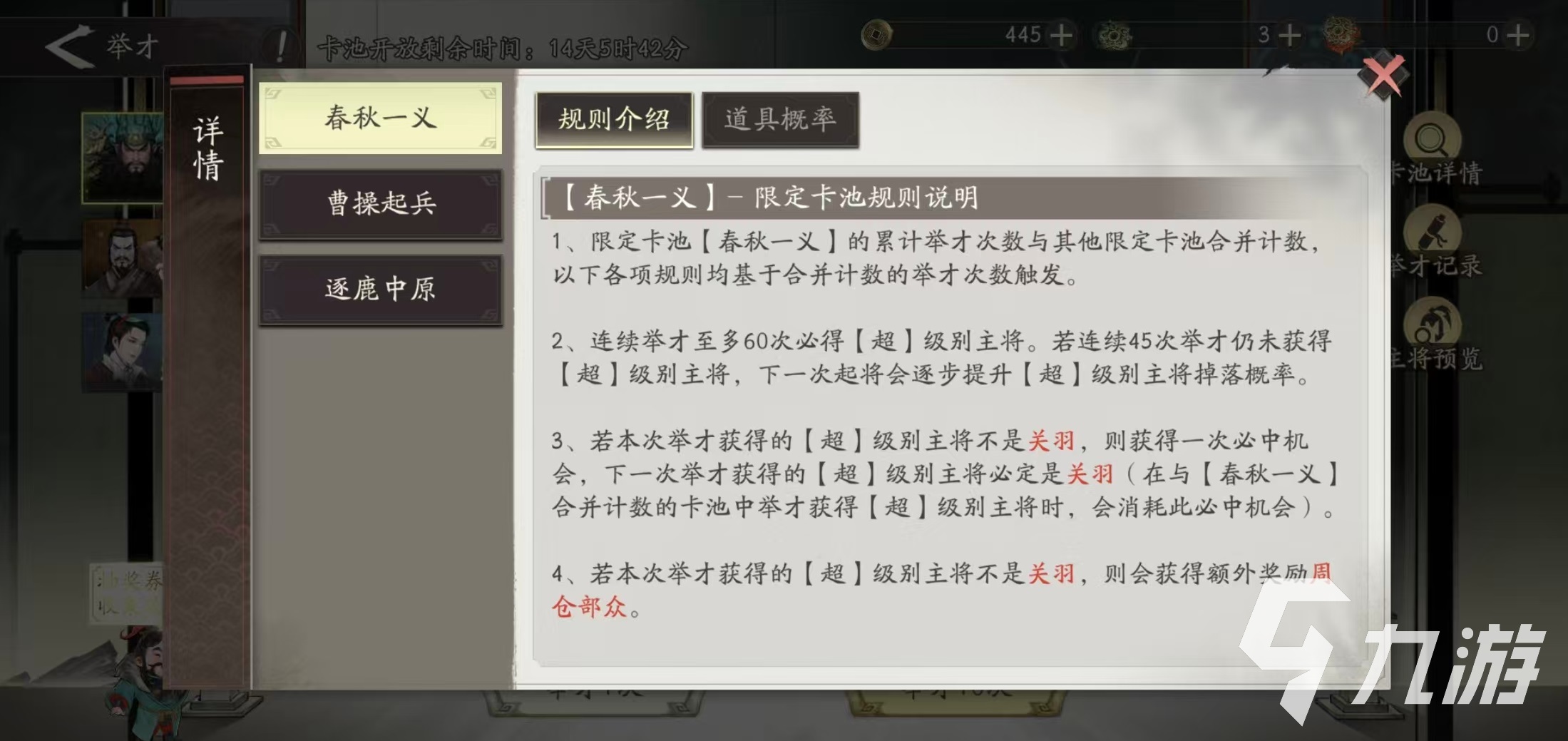 再来看一下限定池,游戏会根据不同的剧本推出不同的限定池,限定池中的累计次数和其他限定卡池是合并计算的,所有的规则都是基于合并次数来触发。在连续抽卡至多60次,必定获得超级别的主将,如果连续进行45次抽卡,仍然没有获得超级别的主将,那么从下一次开始,将会逐步提升掉落概率。如果本次获得的超主将不是限定武将,则获得一次必中的机会,下一次获得的超级别主将,必定是限定武将。例如在限定卡池爱恨英豪中,出现主将张飞的获取概率,就比其他池子中所有的超级别主将都要多50%。如果抽取到的超级别主将并非张飞,可以获得额外的奖励,只要累积抽取达到指定次数,就可以获得夏侯昭等各种奖励,所以限定池很有助于大家养成当前的阵容。