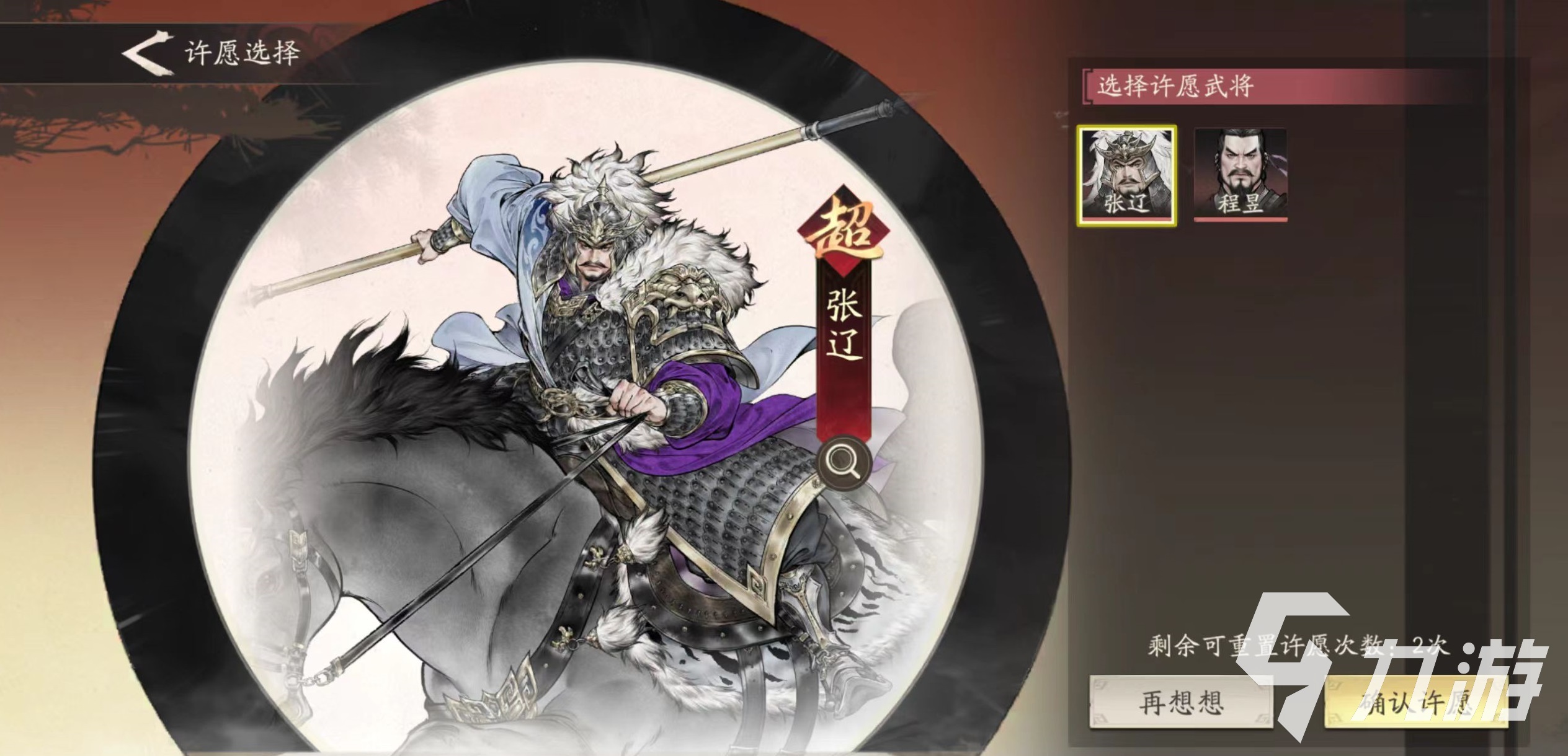 在完成新手卡池的抽取之后,接下来就来到了自选武将概率提升池。之所以叫自选概率提升池,是因为玩家可以根据自己的需求,有针对性的提升特定武将的抽取概率。当然在自选其中也并不是所有的武将都可以加入自选,也会根据当前的版本情况开放不同的武将。例如在之前测试中自选开放的就是程昱和张辽。这里小编就推荐大家优先去抽取张辽,是游戏中泛用性很高的一名骑兵武将,当然程昱作为肉盾型谋士也比较适合选择。