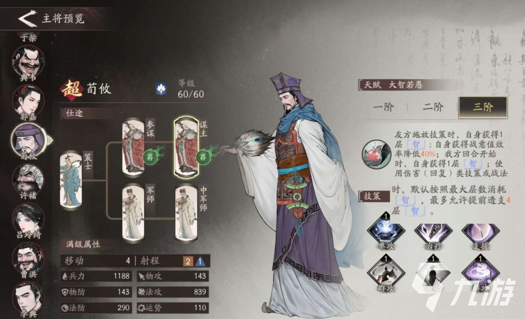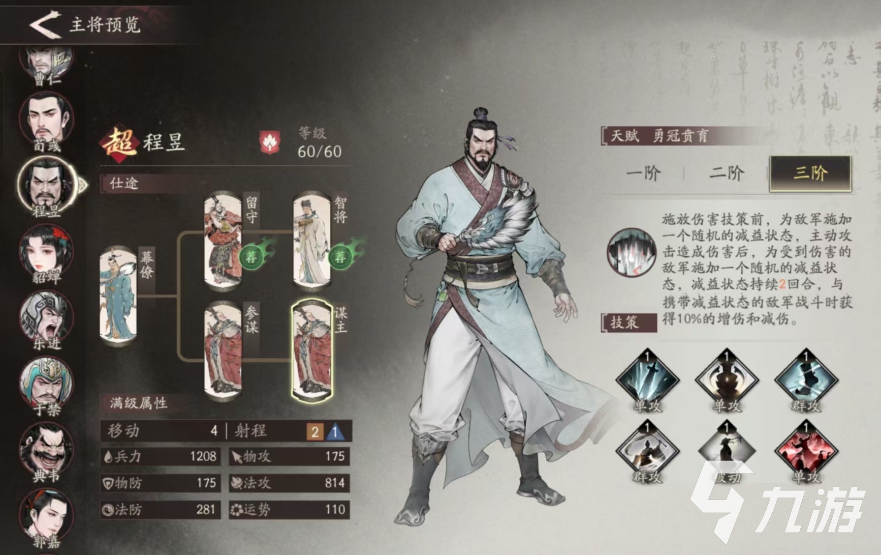 除了郭嘉之外,戏志才还比较适合搭配程昱,程昱天赋非常简单,攻击后为敌方附加随机减益buff,如果使用技能,那么在释放前还可以再附加一次减益Buff,并且对拥有buff的敌人有增伤和减伤效果。本身就比较强势的程昱,再配合上戏志才在输出和减伤方面的加成,使得自身的每一点优势都能够得到放大。其他同样适合的谋士主将还有简雍、荀攸等,虽然和这些谋士,并不是最佳配合,但也能发挥自身的作用。