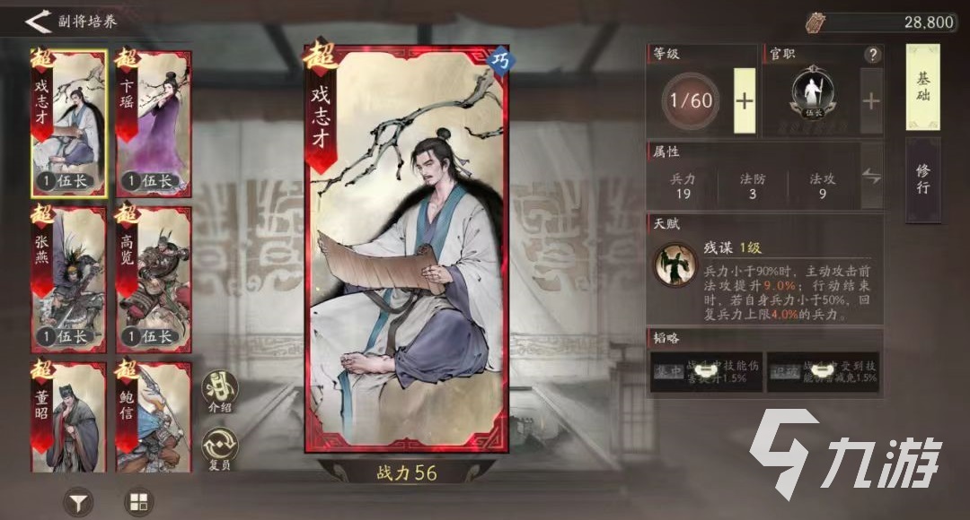 三国望神州这款游戏经过多次测试,不断提升自身的主将和副将机制,现在副将拥有更强的地位和作用。戏志才副将经过多次调整,目前已经正式定型,技能效果是残谋,在兵力小于90%的时候,主动攻击前会提升9%的法攻属性,行动结束时若自身兵力小于50%,能恢复上限4%的兵力。另外还有两个韬略属性可以解锁,分别是集中和识破,集中使得战斗中技能伤害提升,识货使得战斗中受到的技能伤害减免增加。