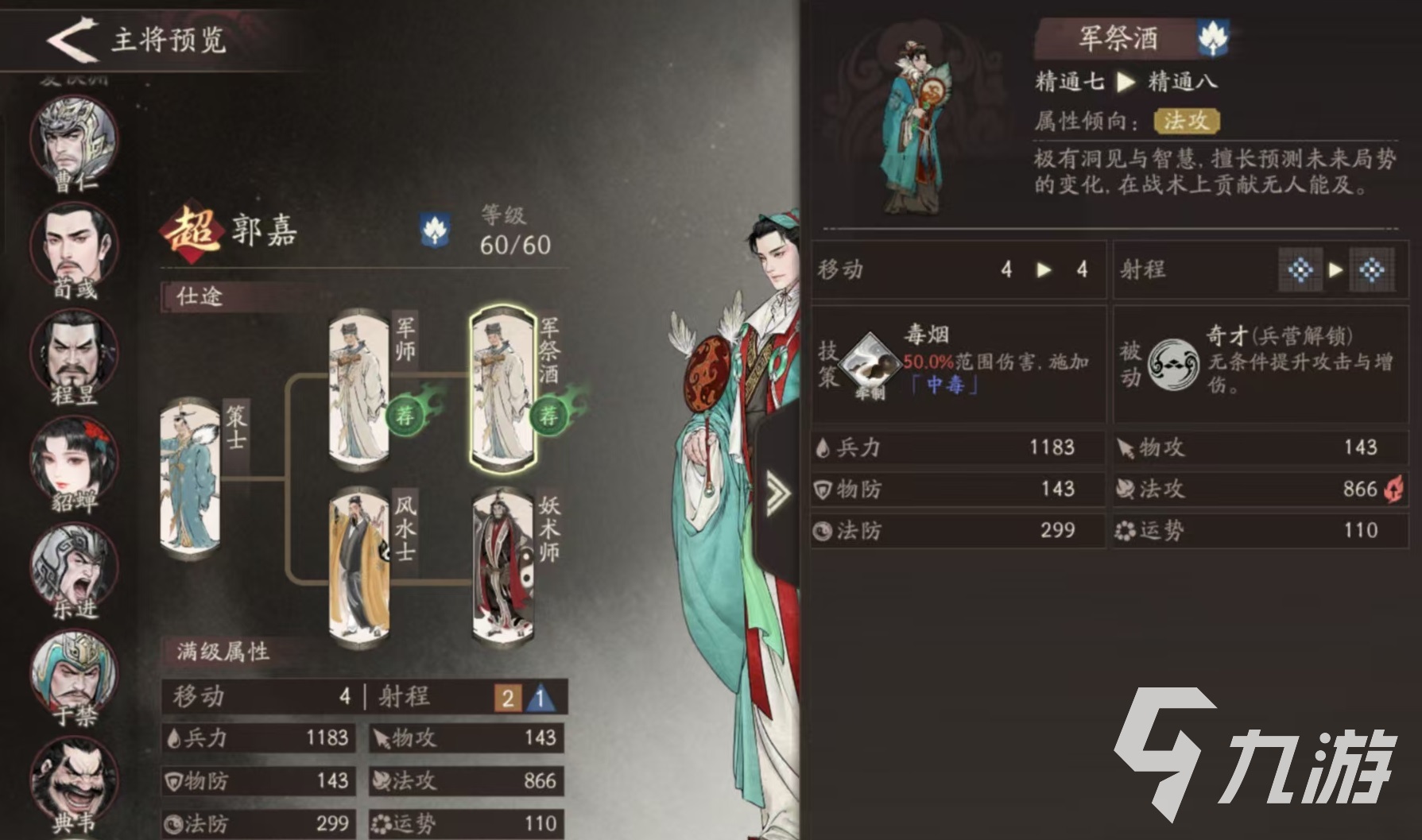 戏志才之所以成为目前副将中的代表,和自身的这些效果是分不开的,主要就是增加法攻,同时增加回复效果。这样的机制非常契合游戏中的谋士类型的武将,所以应用效果非常广泛,在实际应用的时候,戏志才最佳的搭档是郭嘉。郭嘉是游戏中顶级谋士之一,擅长施加负面效果和进行远程控制,是游戏中真正意义上的纯法玻璃大炮,正是因为自身比较脆,所以才需要戏志才所带来的伤害减免,戏志才的伤害提升效果,使得郭嘉在输出方面进一步放大。
