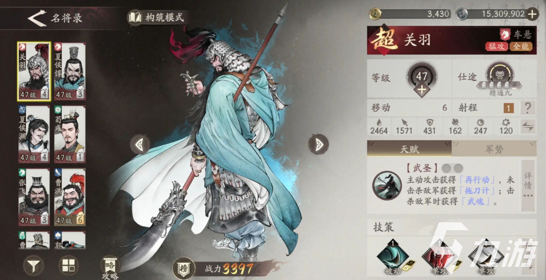 关羽:作为超品刺客类型的骑兵,他能够实现攻防兼备。对于关羽来说,在施展主动技能的时候,可以对目标造成物理伤害,并且还能够直接穿透多个目标,最终可以实现成功效果加强。如果施展了被动技能,那么也能够让敌人松懈,此时在施展主动技能搭配合理之后,就能够扭转整个战斗的局面。