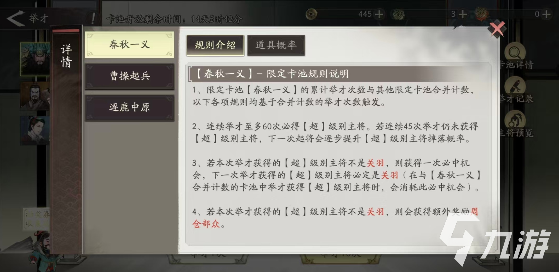 除了出现超品质主将的保底之外,在限定池中还有另一项保底措施,这里保的不是出货率,而是出现限定武将的几率。在限定卡池中,如果玩家第1次获得超级别的主将,不是本期的限定类型,那么就能获得一次必中的机会。该机会指的是下一次在限定池中获得超级别主将,必定为该限定池的限定主将。