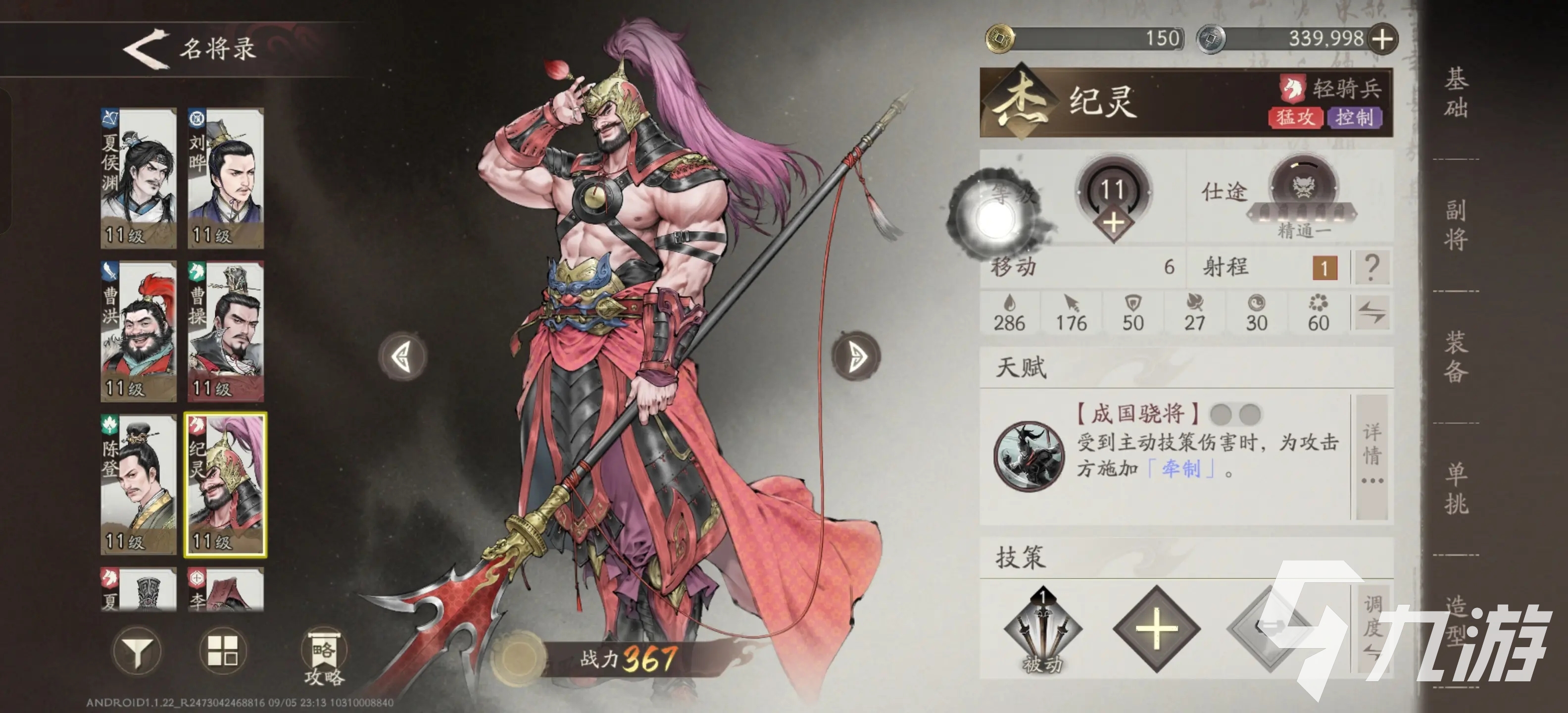 正如前文所说纪灵不适合作为队伍的主将,他更适合的位置其实还是副将,在队伍搭配上可以搭配张辽等强势骑兵英雄,配合骑兵英雄的技能效果控制敌方的技能输出,而且他高阶后还拥有一定的承伤能力,可见纪灵在队伍中可以承担一个可控可抗定位的角色。