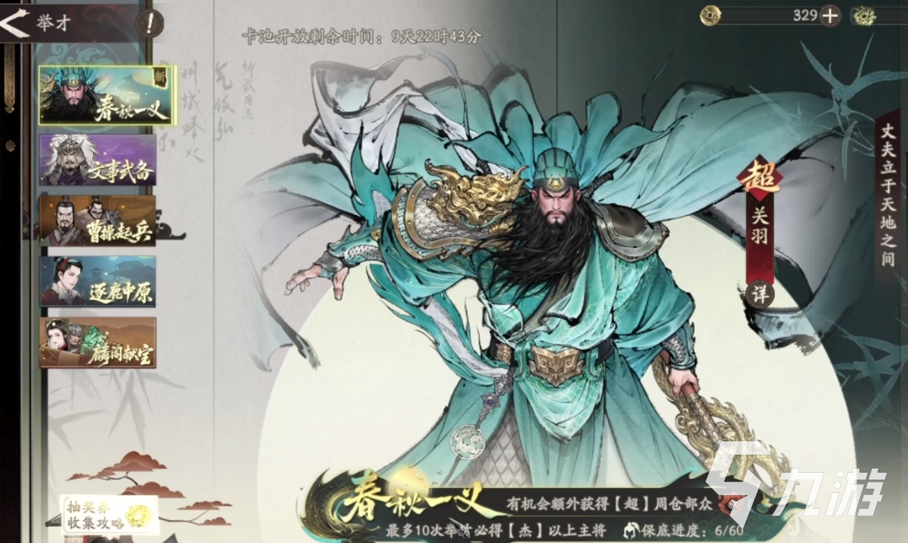 这款游戏会同时举行多个指定超稀有度武将的up卡池,比如开服初就有春秋一义的关羽特定up卡池。这些卡池可以在举才的页面上切换,注意的是上方的卡池开放倒计时,不同的卡池的保底次数不继承,万一过期了就吃不到保底了。而保底的机制是60抽必出当期,最多10次举才必得杰稀有度以上的武将,而且每次抽卡都有机会出同等稀有度的副将。