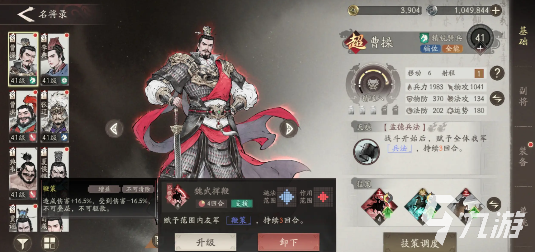 曹操是其中一个具有输出潜力,同时辅助能力非常出色的武将,在初期时可作为副C使用,两个核心技能也是具有相当不错的伤害加成的,尤其是“魏武挥鞭”,实用性很高,前期战斗,一直到后续成型都可持续使用,30级之后的他开始转型,60技基本就是队伍中的核心辅助了。