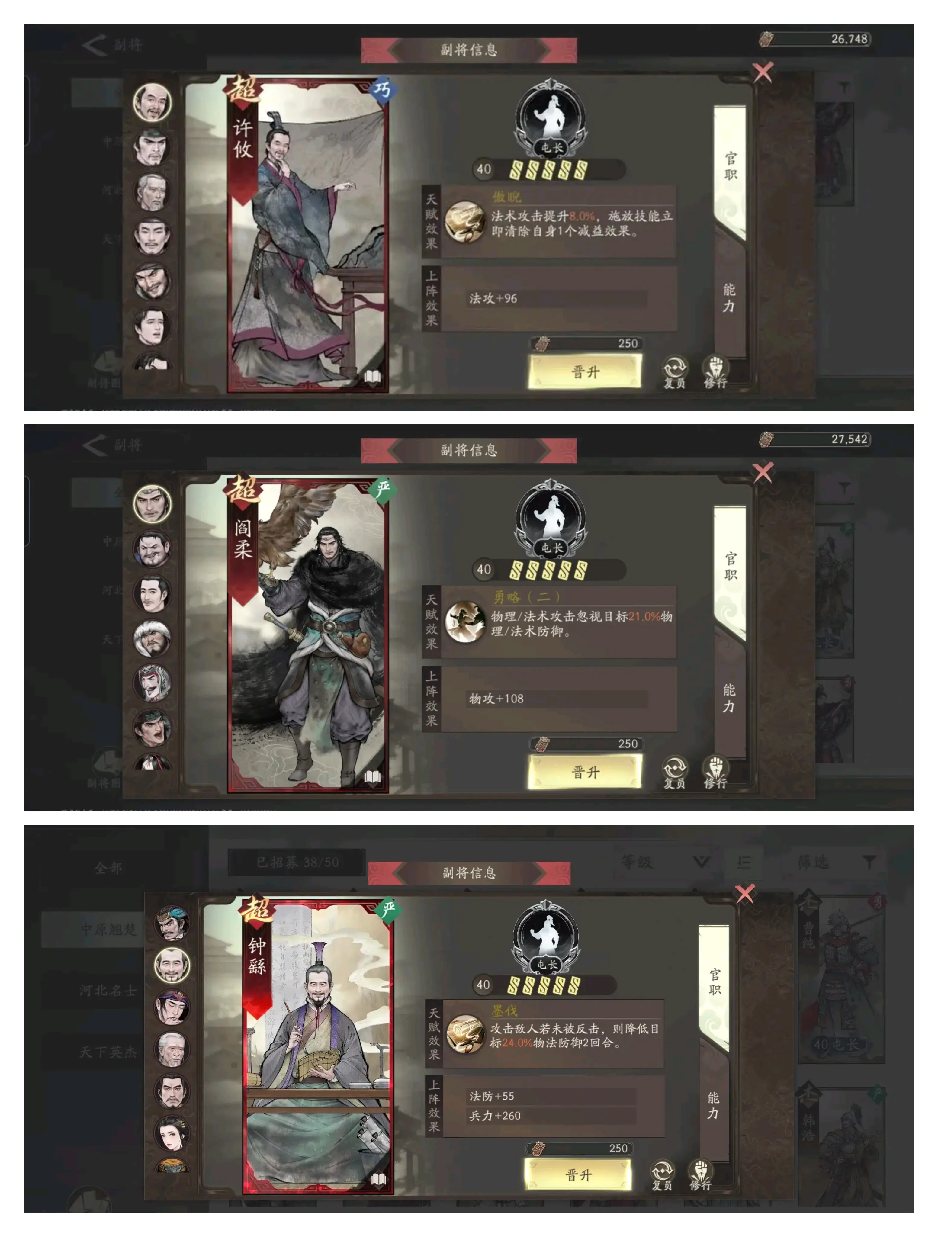 后期:阎柔能提供高额的伤害加成。许攸则能进一步强化于禁的灼烧伤害,是火矢兵路线的绝配。如果需要于禁承担部分辅助功能,也可以选择钟繇。
