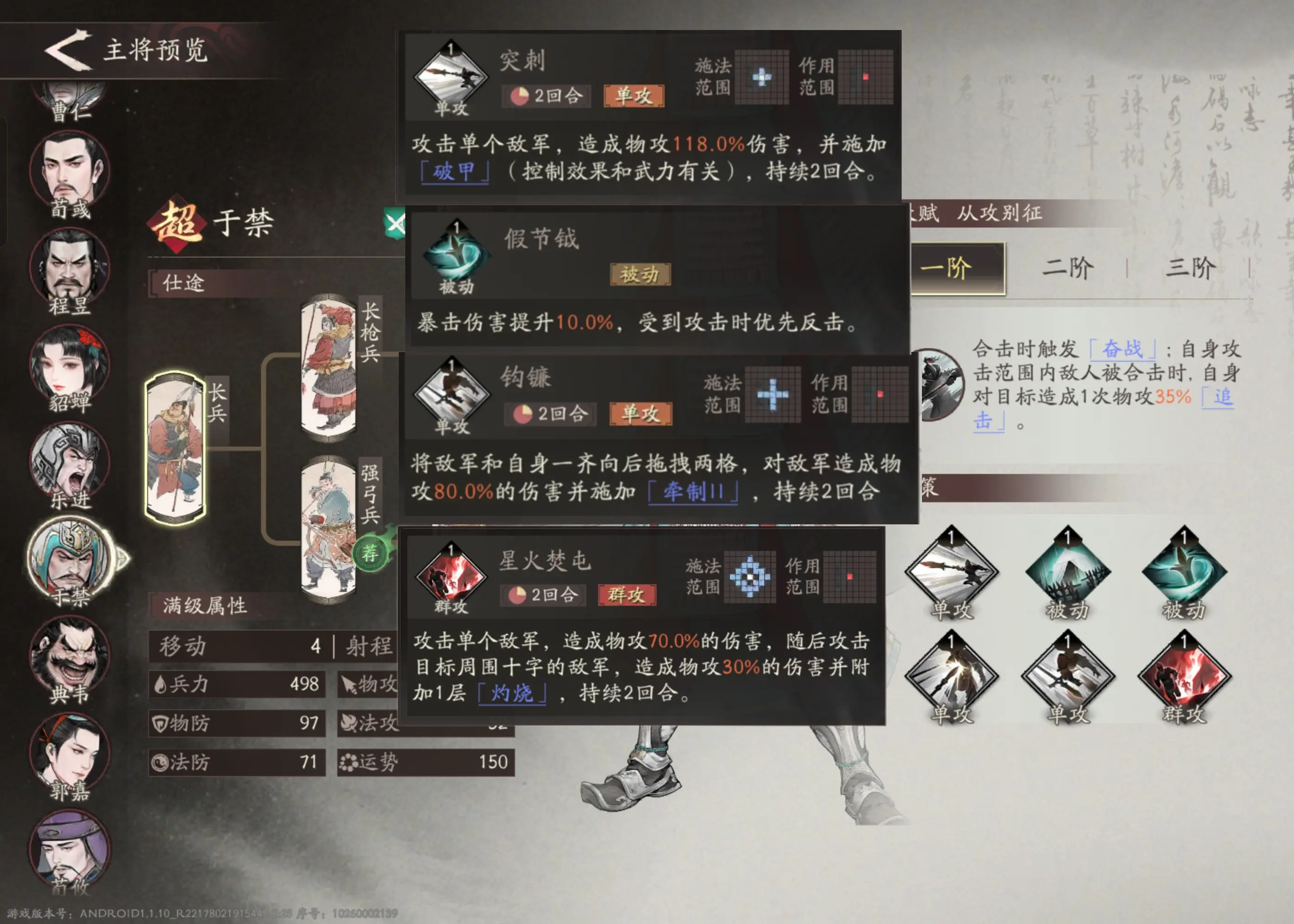 于禁的技能选择,清晰地反映了他在不同游戏阶段的角色转变。