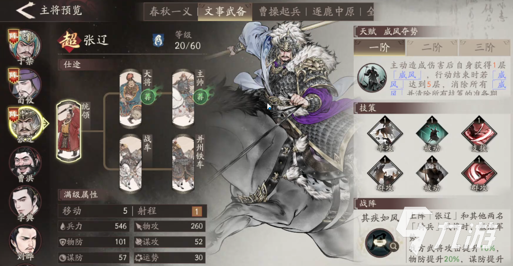 臧霸作为副将,主要的功效就是增强主帅的输出能力,特别是对于骑兵主帅的话,能有出其不意攻击效果,比如说联合夏侯淳的话,可以提高他的暴击率和加强他的克制能力;在联合吕玲绮的时候,能让她有更强的控制能力,在其释放【封技】的时候能针对更多的目标。