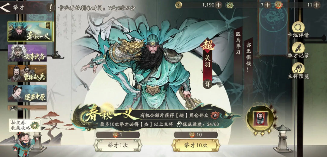 三国望神州关羽这就是阵容中的输出大c,关羽的再行动机制就等同于是版本答案,无论是新老玩家都应该尽早的入手,但是应该如何来获取呢?三国望神州关羽如何获得?下面就为...[详情]