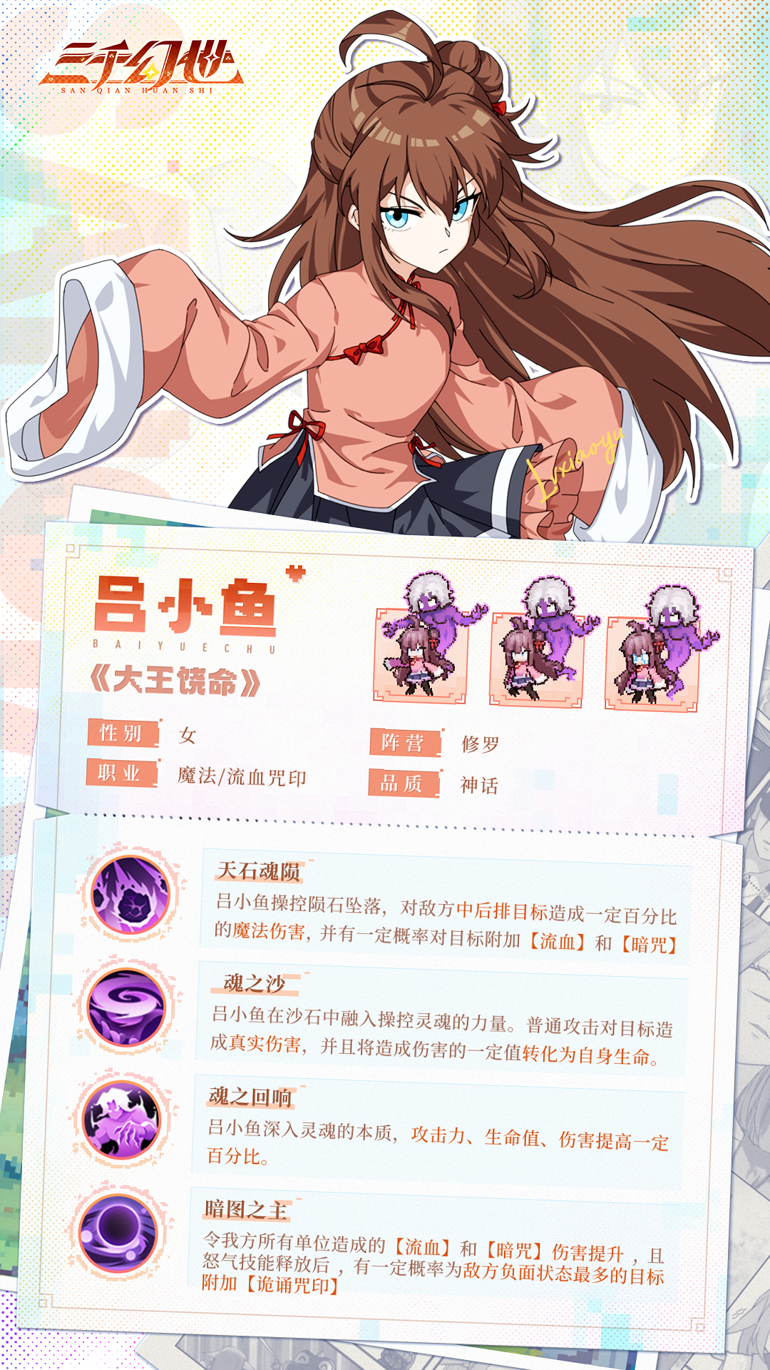 从技能来看,吕小鱼在长线战斗中非常适用,战斗中可以为中后排敌人造成伤害,同时为敌方附加一定的流血、暗伤状态。并且可以将自身对目标造成的部分伤害转化为生命值,将自己的在线时间延长,很大增强了持续输出的能力。并且技能能够为队友提供增益并延长敌方负面状态,在实战中一定会有亮眼的表现。