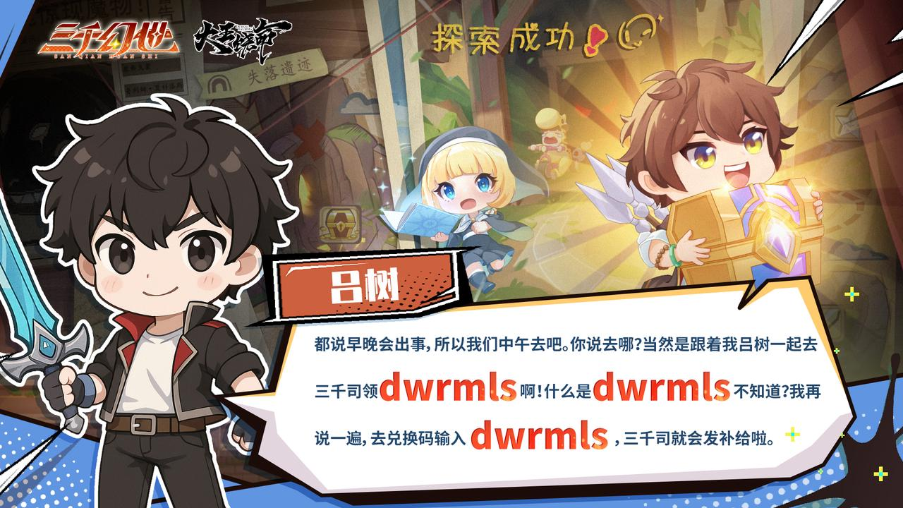 你说去哪?当然是跟着吕树一起去三千司领【dwrmls】啊!什么是【dwrmls】不知道?我再说一遍,去兑换码输入【dwrmls】,三千司就会发补给啦。