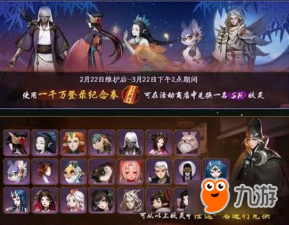 神都夜行录手游一千万登录活动,给玩家一个SR妖灵任选的奖励,可以选择一个SR妖灵免费领。神都夜行录SR妖灵任选换哪个好?神都夜行录自选SR哪个值得换?九游小编分...[详情]