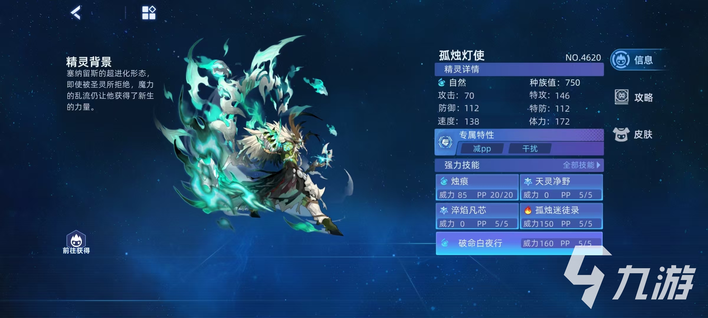 这个精灵在种族值方面还是有些优势的,尤其是自身的体力172更是非常突出,其他属性方面特攻146,速度138,特攻和体力是最大的优势,这样就能保证有输出和生存能力的基础。在技能方面,输出技能主要依靠破命白夜行、孤独迷途录、烛痕等。破命白夜行属于必中类型的特殊攻击,威力160,还具有消除对手回合效果,消除成功后令对手烧伤,为对手施加异常,以及为自身带来恢复、减伤和吸血等一系列效果。