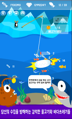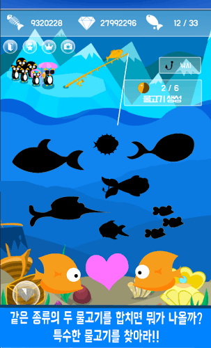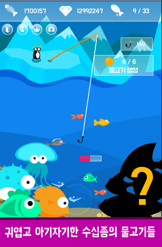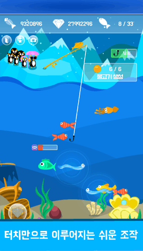 ☆ 이벤트 > 현재 보석 200개 무료 증정 이벤트 중입니다. > 얼릉 오셔서 받아가세요~☆ 핵심 포인트 > 아무 생각없이 즐겁게 할 수 있는 게임! > 하다보면 어느샌가 시간이 흘러가있다!? > 낚시로 포장된 방치게임 > 시간때우기의 끝판왕!! ☆ 펭귄 부자만들기 프로젝트 > 바다속 물고기들을 수집하고 키워서 펭귄을 부자로 만들어보자 > 펭귄이 부자가 되기 위한 필수조건! 물고기의 성장과 낚시 > 둘을 적절히 조화롭게 사용해서 더 많이 벌어보자 ☆ 새로운 물고기의 발견 > 두마리의 물고기들을 결합! > 아기자기하고 귀여운 물고기에서부터 왕큰물고기까지 > 약 50여가지 바닷속 물고기들을 수집해보자 > 단, 몇몇 무서운 물고기들과 바다를 위협하는 쓰레기들은 조심해야하는 건 잊지말아야겠죠!? ☆ 낚시, 그 선택의 순간 > 물고기 뼈와 보석을 많이 얻을 것인가? 아니면 계속 키워서 수집할 것인가? > 선택은 당신의 몫. > 시도하는 횟수가 많을수록 더 많은 물고기 뼈와 보석이 펭귄손에!! > 낚시를 통해서 보석을 획득할 수 있어요. ☆ 게임 방법 > 같은 종류의 물고기를 터치하세요~ > 무서운 물고기들은 따로 터치하여 관리해주세요 > 펭귄이 먹어야하면 안되는 것들은!? > 펭귄이 잘못해서 죽으면 터치로 되살려주세요. > 여러 물고기들을 모아주세요 > 능력치를 업그레이드 해주세요. ☆ 테스트평 > 별로 재미도 없는 것 같은 데 몇 분 해보다보면 어느 순간 물고기를 수십마리 거느린 나를 발견할 수 있다. > 나는 생각이 없다.. 생각이 없다.. 생각이 없다.. 아나 물고기 먹혔잖아 > 이걸 왜 한다고..............................................!? 하다보니 시간이.. ☆ 주의사항 > 삭제시 게임 데이터가 전부 날아갑니다. 복구 안되요 > 기기간 이동이 불가능 합니다. > 게임 스크린샷 캡쳐를 위한 정보 외에 별다른 정보는 필요하지 않습니다. (스크린샷을 찍어서 친구들과 공유할 수 있게 갤러리 데이터에 접속은 허락해주시고 전화 목록 및 걸기 접속은 취소해주세요) ☆ 버그 제보는..? > 아래 적힌 메일 주소로 제보해주시면 사례는 없지만 열심히 고쳐보겠습니다. > jinmyoun2000@naver.com ☆ 특별한 감사 > 유투브 오디오라이브러리 - At the fair(the green orbs) / How it began(SilentPartner) / Dog and Pony show(Silentpartner) ---- 개발자 연락처 : jinmyoun2000@naver.com ★ 버그 수정 > 전화올시 배경음이 종료되는 현상 수정 > 낚시 포인트 변경