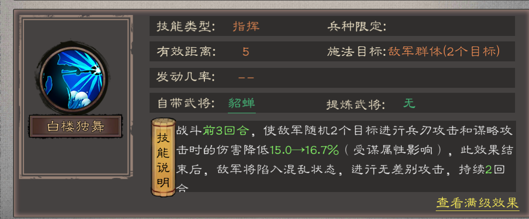 核心价值来自自带技能“白楼独舞”:战斗前3回合降低敌军2目标的兵刃/谋略伤害(受自身谋属性加成),后续还能附加2回合混乱效果,兼具减伤与控制,是前中期阵容的优质辅助选择。