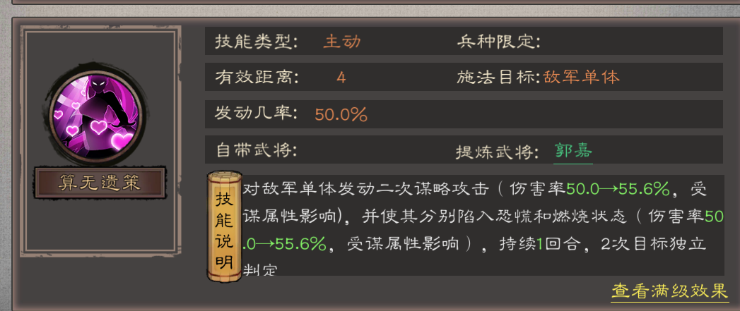 效果:对敌军单体发动2次谋略攻击,附加恐慌+燃烧双状态,适合作为郭嘉的补伤技能,强化单体压制能力。