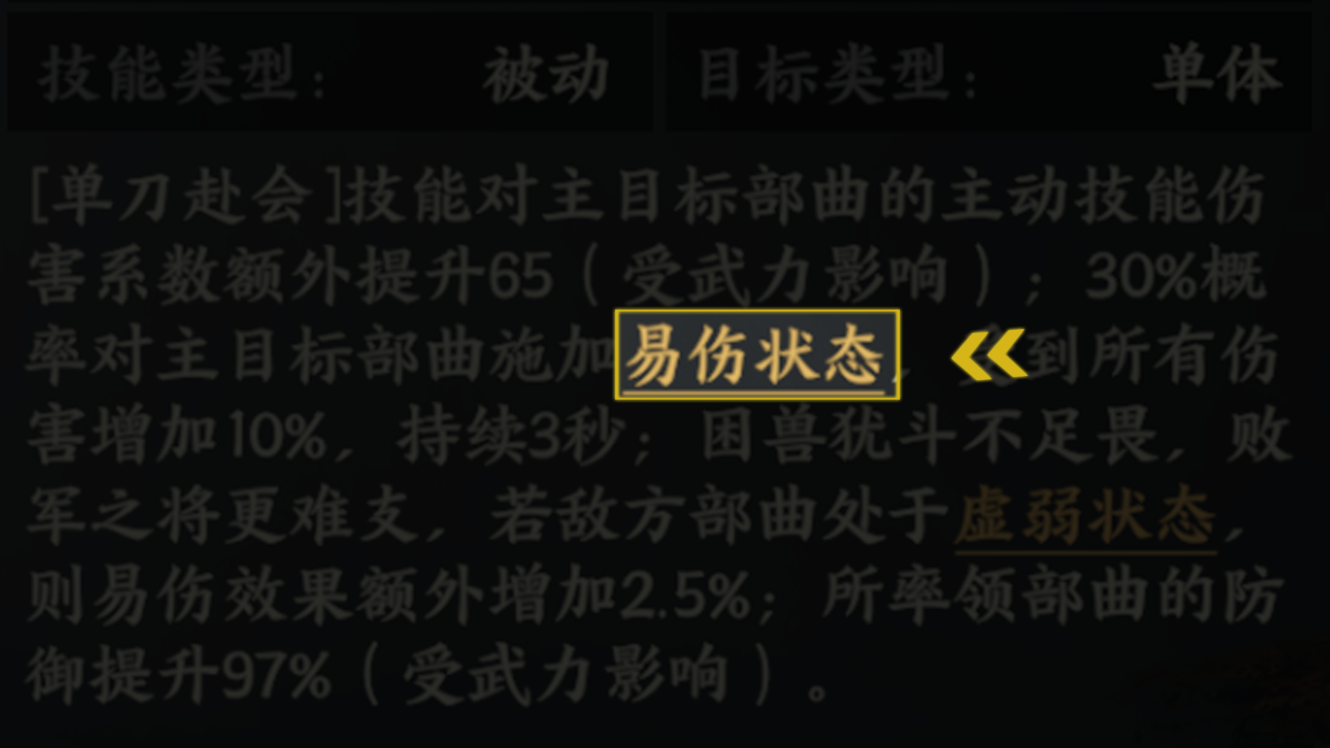 应用场景:易伤效果能提升集火收益与技能联动的效率(如程昱多段伤害),非常适配大多需要高爆发压制的部曲,战场中可以给需要集火的敌方部曲施加易伤效果,来更快的实现减员。