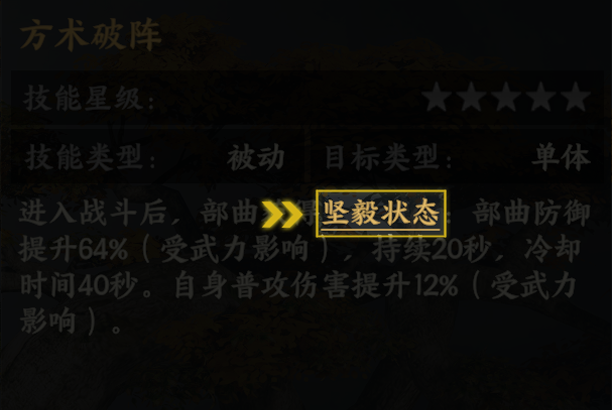 【坚毅状态】:在坚毅状态期间,部曲防御提升,有时间冷却。