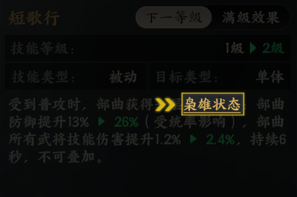 【枭雄状态】:在枭雄状态期间,部曲防御提升,部曲所有武将技能伤害提升