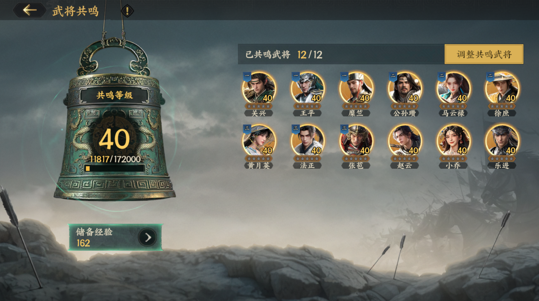 经验不是转移,而是共享了!主公只需把武将加入共鸣槽位,所有武将等级自动提升至最高武将的等级,不再需要重复战斗获取经验。