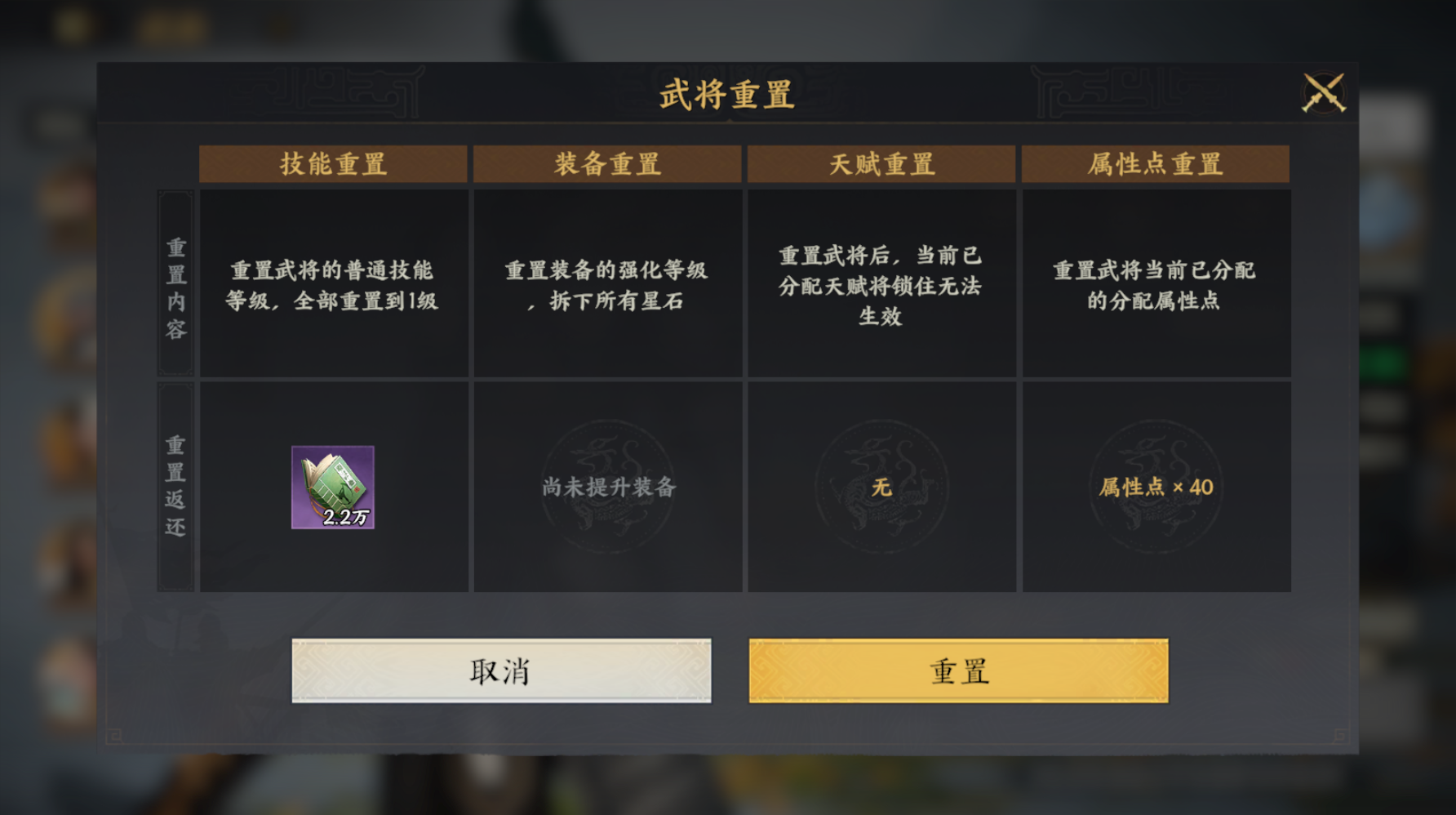 免费一键重置武将,百分百返还武将技能经验,主公可以非常快捷培养新的武将,测试不同阵容的玩法,为主公节省下宝贵的时间和精力。