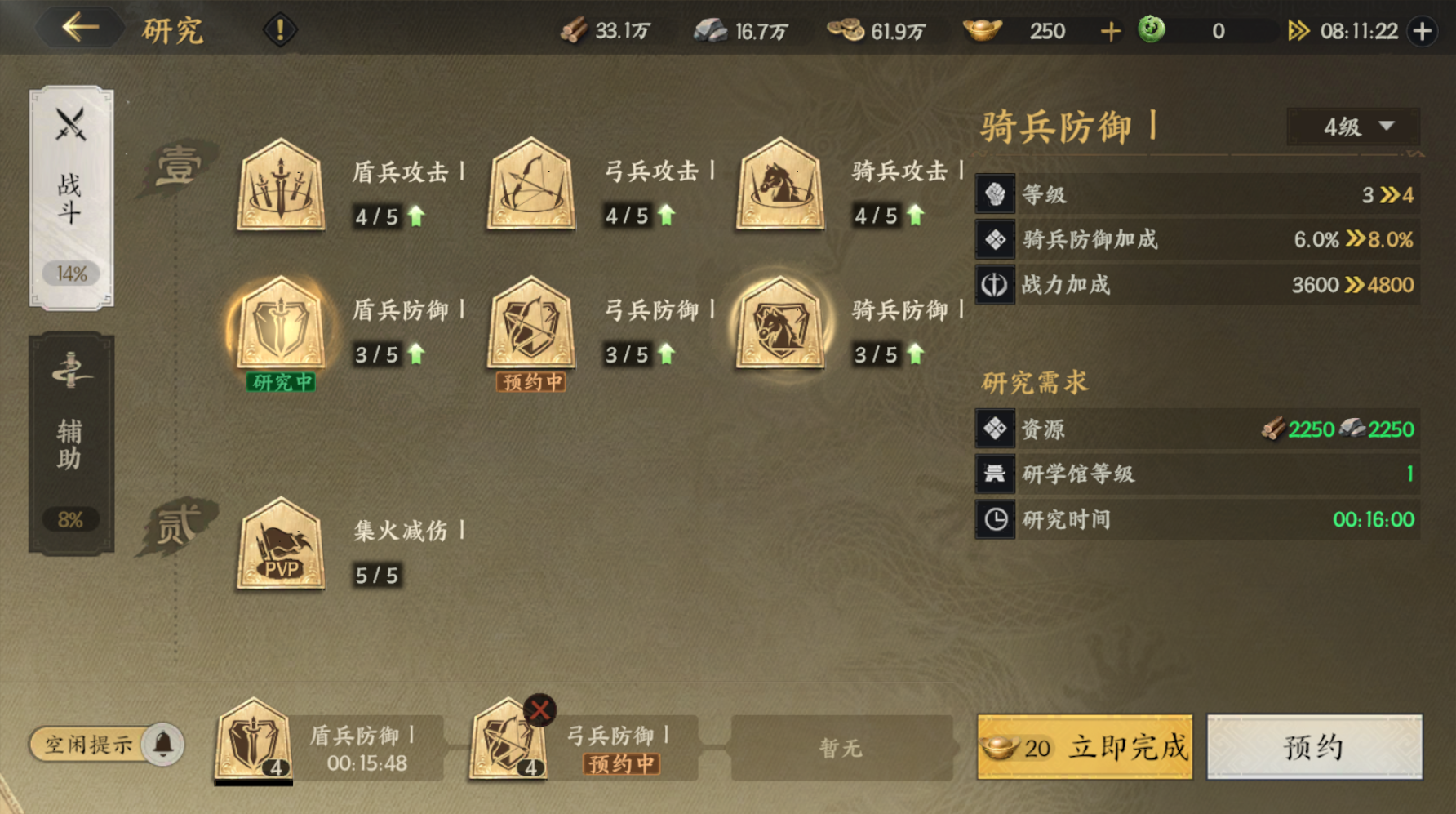 为减少主公反复手动操作的频次,您可在主城内的研究所提前预约想学习的研究项目,最多支持排队三项。无论主公是前往沙场征战,还是忙于其他,研究都会自动推进~